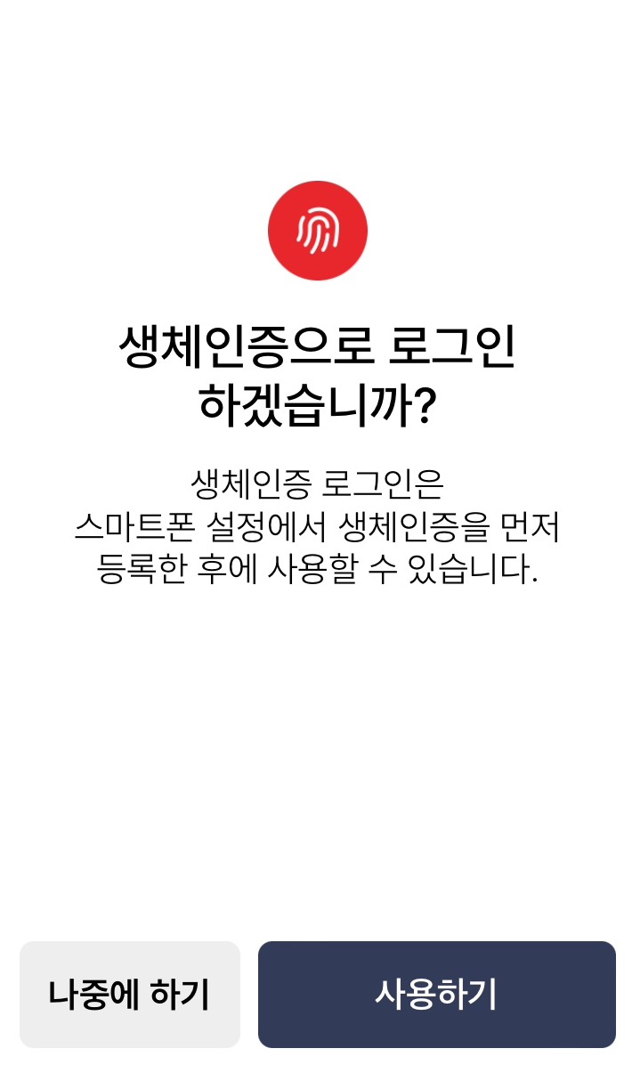 비밀번호는 생년월일, 동일 연속 숫자 3자리는 사용 할 수 없습니다. 비밀 번호 설정 후 생체인증로그인도 등록 할 수 있는데 저는 비밀번호를 누르는 것보다 생체인증이 편하기 떄문에 지문등록까지 해 놓았습니다.